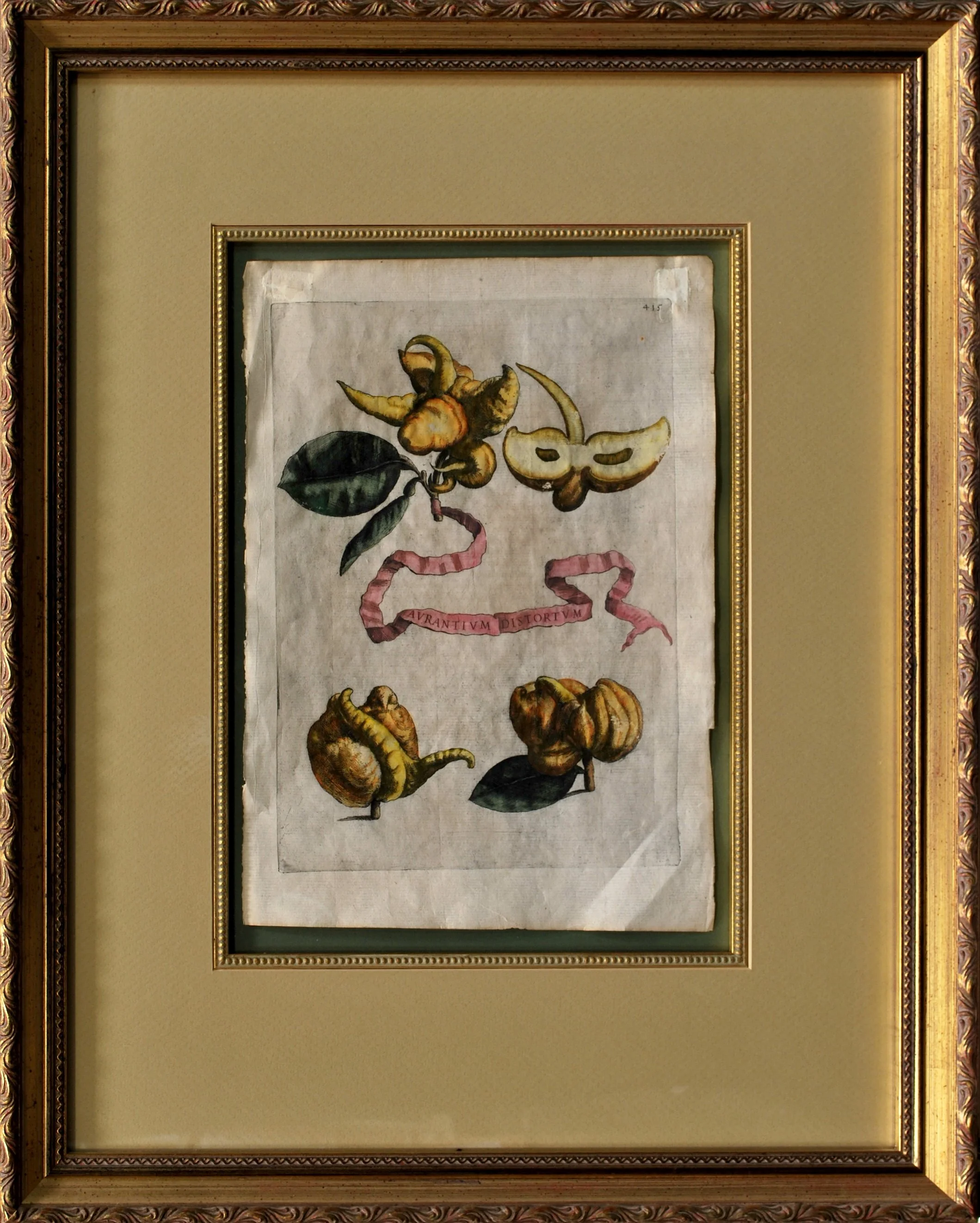 Captions read (1) Limon perettae consimilis, (2) Limon a rivo sev rio, (3) Aurantium distortum, (4) Aurantium crispum folio, (5) Limon striatus vulgatior. These plates are from Giovanni Baptista Ferrari’s 1646 book on citrus fruit Hesperides sive de Malorum Aureorum cultura et usu. Libri Quator [“Golden Apples” from The Mythological Garden of the Hesperides].The book is considered to be “one of the most splendid and scientifically precise botanical works of 17th century Europe. Its illustrations, etched by Cornelis Bloemaert, were designed by the foremost artists of the day, including Nicolas Poussin and Guido Reni.” Ref: The Met, Worcester College (UK)